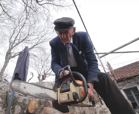 ![]() Grujic cuts wood (aged 101) in March 2016. | |
